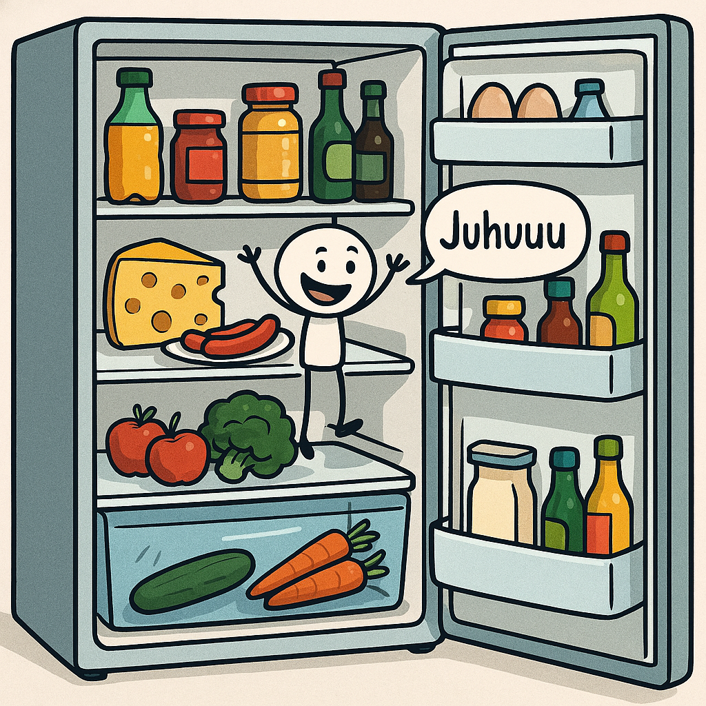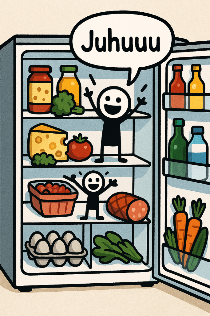 Ich habe mich auf eine Größe von etwa 1 bis 2 Zentimeter geschrumpft und einen Kontrollgang durch den Kühl- und Gefrierschrank gemacht. Nach menschlichem Ermessen muss ich am 30. und 31. Dezember nicht raus, nichts mehr einkaufen. Gut!